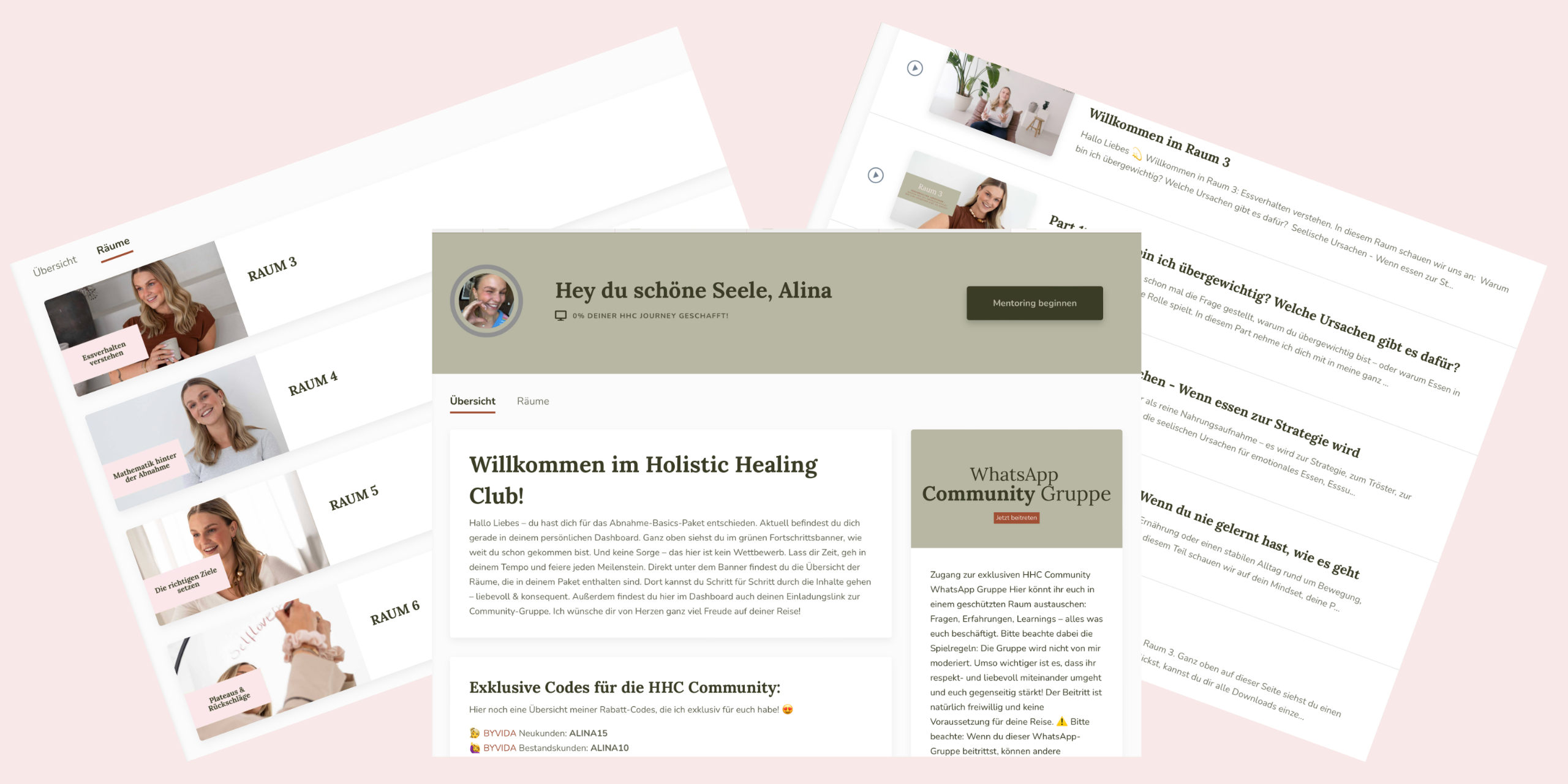Neben den Basics erhältst du Zugang zu den Räumen Food Noise & emotionales Essen, Inneres Kind, Glaubenssätze und Gesunde Grenzen. Dort geht es darum, dein Essverhalten auf einer tieferen Ebene zu verstehen, alte Muster zu erkennen und neue, liebevolle Strategien für dich zu entwickeln.